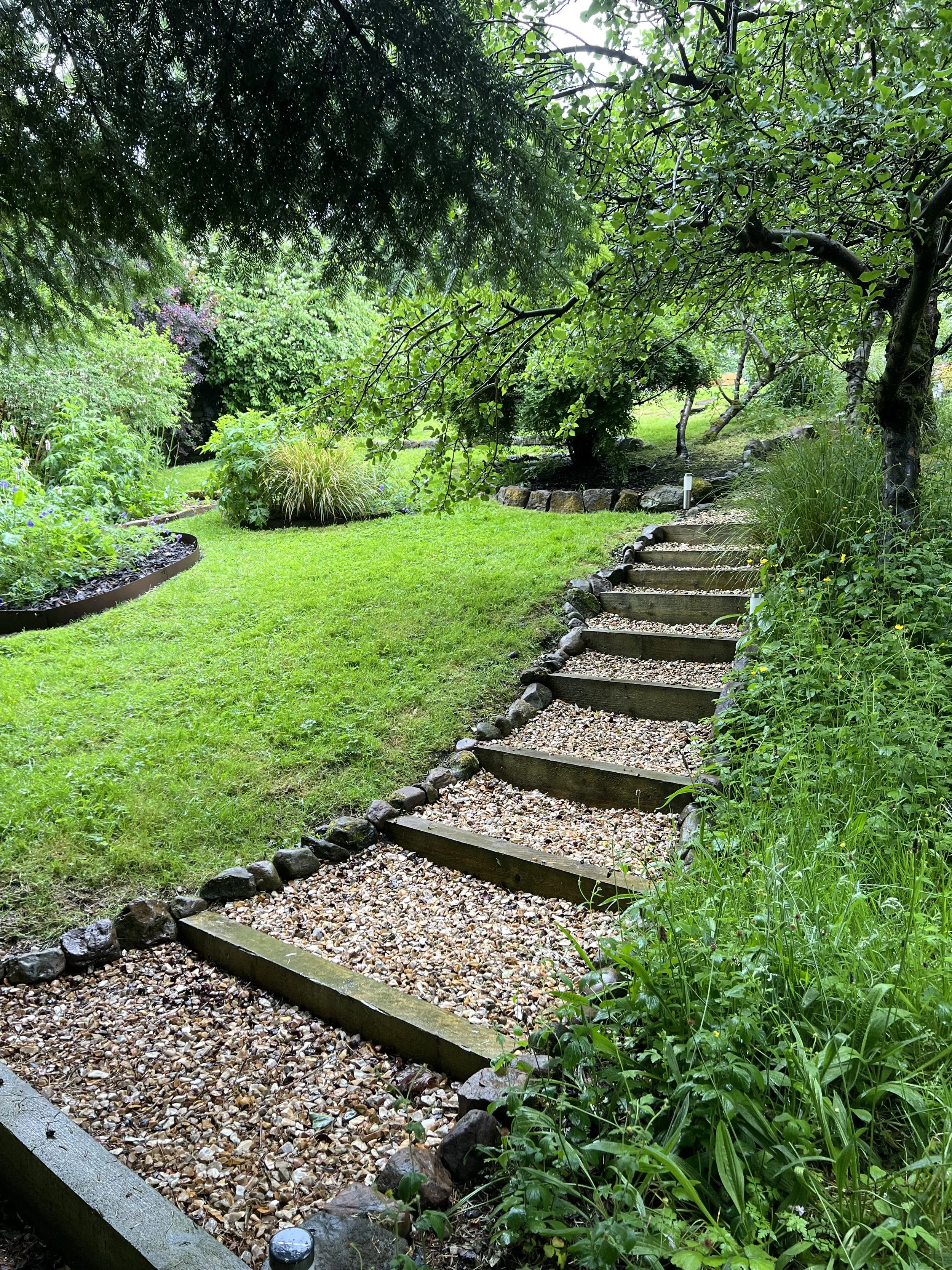 At the back of the property is a narrow, sloping garden with stepped access to Kenly Water.